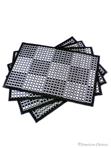This is a set of 4 large bamboo placemats. The placemats are made from bamboo squares and silver thread which looks attractive and is easy to clean. Light fabric backing and fabric frame gives the placemats a very finished look. Approximate Dimensions: Length: 17 1/2", Width: 12" each..../ Set of 4 Black & Silver Squares Bamboo Placemats 12x18 / Wood Bath